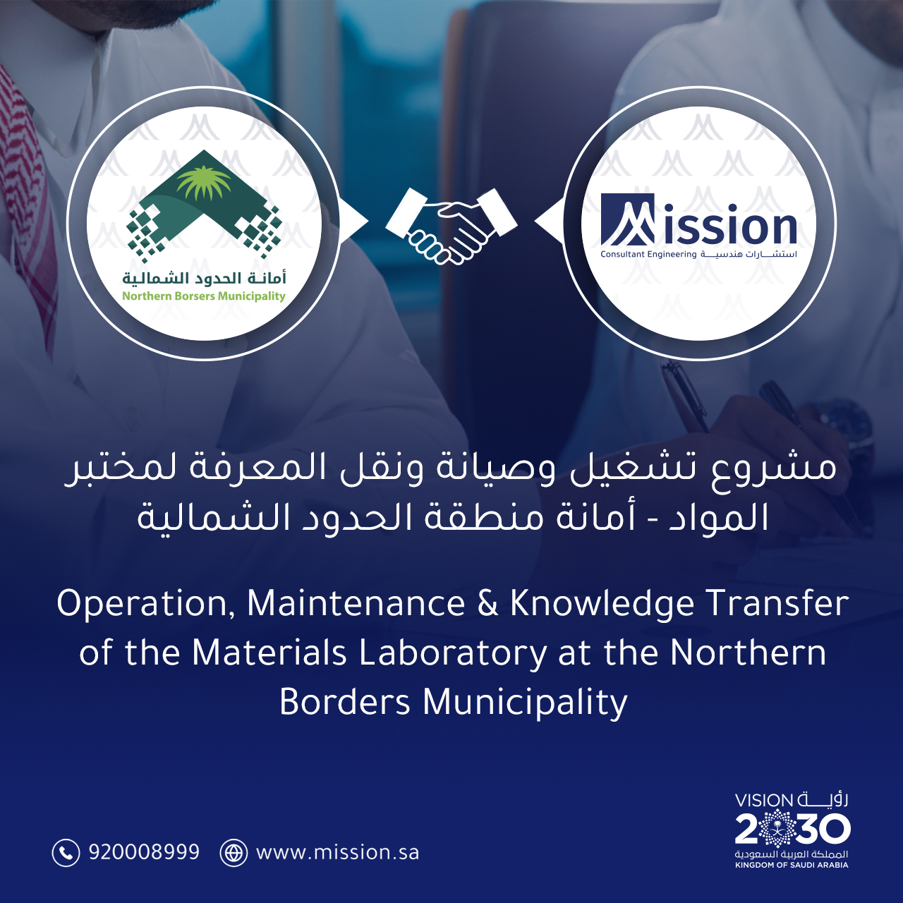 With great pride and appreciation, we are pleased to announce the official awarding and signing of the contract for the project: “Operation and Maintenance of the Materials Laboratory at the Northern Borders Municipality (Operation, Maintenance, and Knowledge Transfer).”